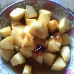 将泡好的苹果倒入锅中,翻炒几下后迅速拿出来。我这是没有迅速盛出来。