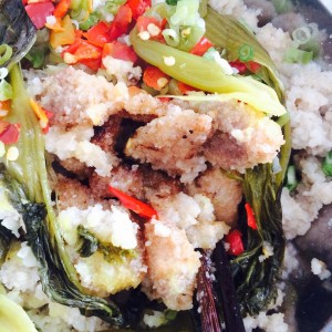 锅洗干净,仍然是小火,锅热后放少量油,待油七成热时,一块一块下肉,移动炒锅,煎至金黄关火,夹出煎好的肉。剩下没用完的米粉,用水拌匀后铺在边上