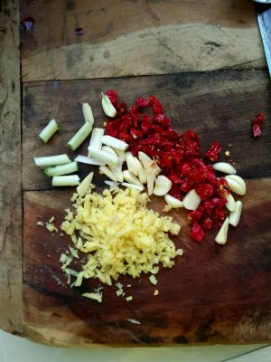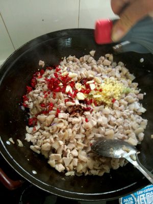 加入葱姜蒜,辣椒段,家里没大料了,所以加了香料等磨的粉