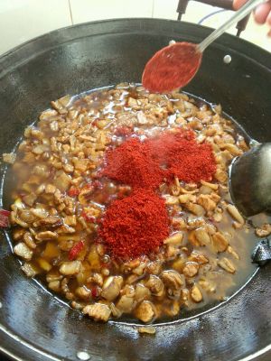 小火炒至辣椒面融化,加入味精,搅拌片刻,即可出锅