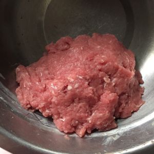 肉馅中放上蛋清 盐 白胡椒粉顺着一个方向搅拌起来。然后摔肉馅,目的是出胶质,让肉馅摔出弹性。