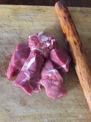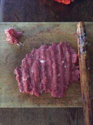 牛肉用擀面杖敲打成肉糜,这个过程我用了一个小时,如果用两个擀面杖或者力量更大些应该会事半功倍,小女子做不到啊!