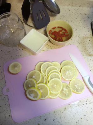 买来的柠檬用盐清洗干净以后 , 如图切片 , 我用的是土蜂蜜 , 甜而不腻 , 然后温水泡一些枸杞 , 一个密封罐 , 切片的柠檬每一片都裹一层蜂蜜然后放入罐中 , 一层铺满倒入适量的蜂蜜和几颗枸杞 , 以此类推 .