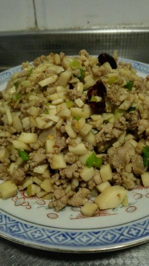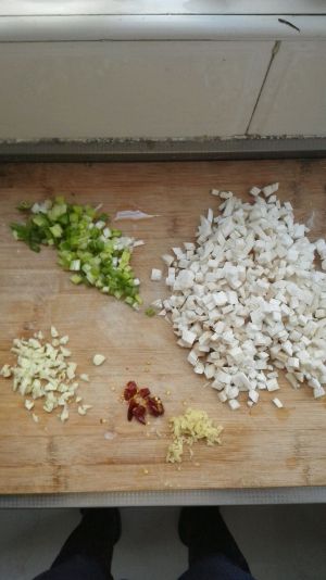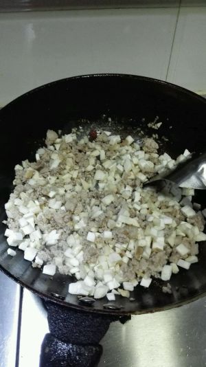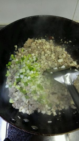 炒熟后放入葱末和蒜末。加少许盐。翻炒。