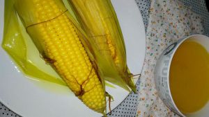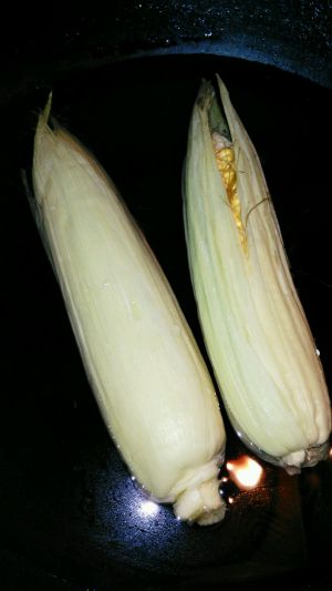 玉米剥去外皮,留最后一层或者两层薄皮。把玉米连同玉米须清洗干净。