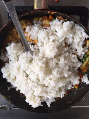 第八步:把隔夜的米饭放入炒锅中,翻炒均匀。