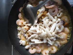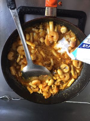 第六步:在炒拌均匀的海鲜中,加入椰浆,翻炒均匀。