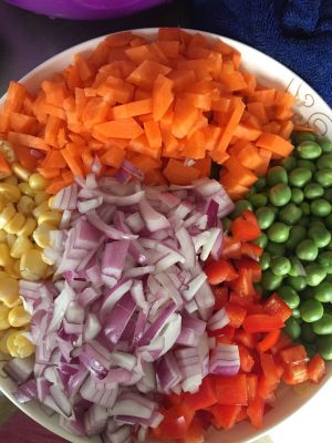 第一步:把洋葱、红辣椒、胡萝卜切丁,玉米粒、青豆洗干净备用。