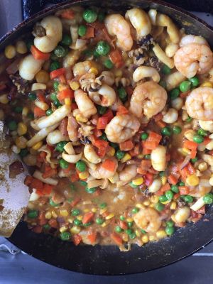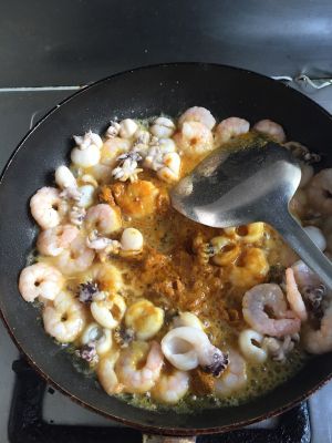 第四步:把锅烧热,放入植物油,然后把虾仁合墨鱼仔放入锅中煸炒,待变色,放入咖喱酱搅拌均匀。