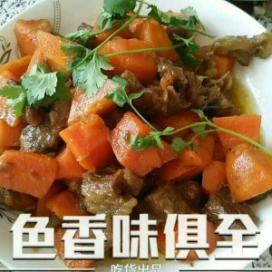 7.糖炒好后,倒入牛腩,将每一块牛腩上色成糖色,倒入酱油,盐,葱,煸炒至香味出,倒入胡萝卜继续炒,最后倒入开水没过牛腩即可!