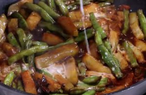 将茄子下锅炒软盛出。锅中加花椒、八角、大葱和蒜末爆香,将豆角下锅炒至上色后,加入酱油和水煮开。将一个家乐猪骨浓汤口味浓汤宝下锅,搅拌至均匀。