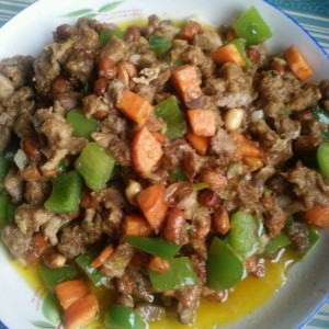 1准备青椒1个葫萝卜I根鸡肉半斤熟花生半斤葱姜蒜少许老抽料油糖l盐五香粉酷生粉适量一····