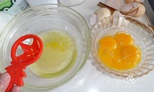 将蛋黄蛋清分离。(分享一个小秘诀,可以将鸡蛋打出来之后用矿泉水瓶对准蛋黄一吸,便可轻松分离鸡蛋)