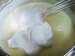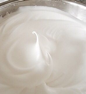 在蛋清中加入几滴白醋,紧接着用打蛋器打发成这个状态即可。注意,途中要分三次加入白砂糖。