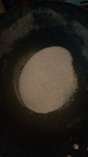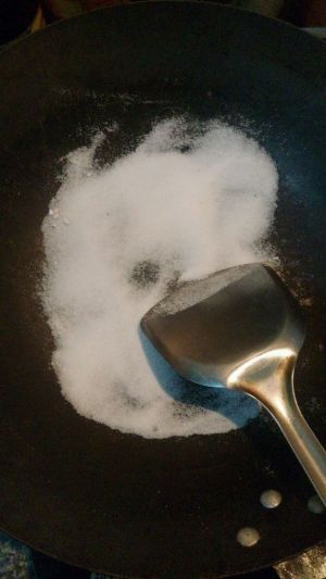 适量的盐,也要小火翻炒,直到盐变成为黄色。(想要省事的话也可以花椒和盐一起翻炒变色炒出香味即可)