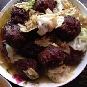加入没过狮子头即好的水量,盖好锅盖,大火烧开,烧开后转小火继续煮