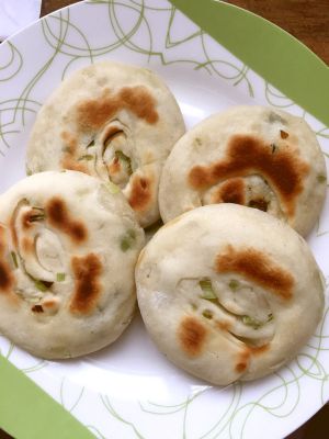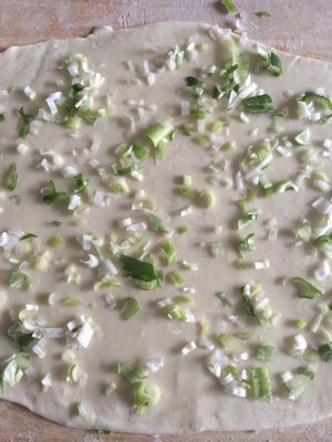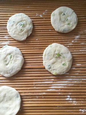 先在面的表面撒一些盐,这个按照自己的口味轻重,然后表面均匀的刷上油,我用的是花生油,然后撒上葱花,其实再洒一点椒盐或是五香粉也不错