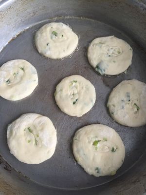 锅底刷一层油,把饼放入锅呢,小火慢煎,底部上色,表面鼓起,然后调面