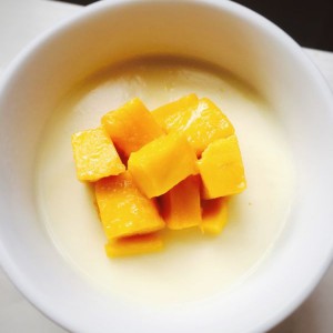 冷却后放入冰箱冷藏两小时左右 切芒果丁摆入