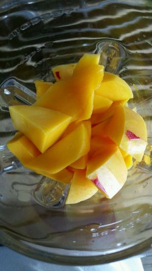 芒果切块,倒入奶油,打成浓浓的果酱。