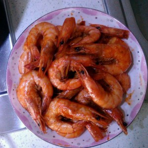 大虾清洗干净,牙签挑出虾线,葱姜蒜爆锅,放入大虾翻炒。