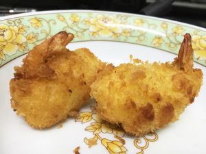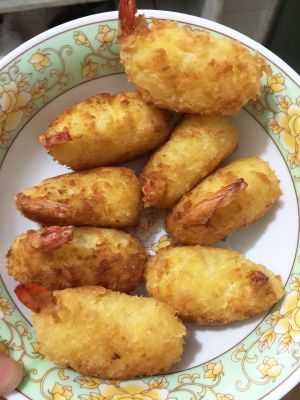 用土豆泥包裹虾,虾尾巴留出来。裹一层蛋液再裹一层生粉,然后裹一层蛋液再裹一层面包屑,下油锅。炸到漂亮的焦黄色。就可以了。