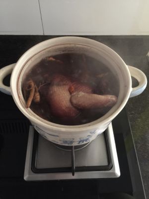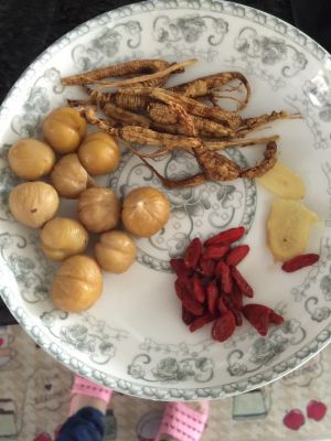 放黑米和二根人参,栗子可以填补在外层,可以防止黑米煮的时候跑出来,多余的材料可以直接放在沙锅里。
