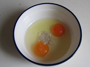 在盘上洒点生粉, 将一圆片铺在盘底后, 倒入搅拌好的鸡蛋液;