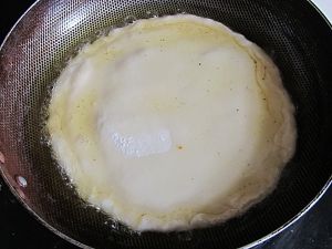 . 两面金黄色后, 且饼鼓起来了, 就将做好的饼捞出放在厨房纸上吸油;