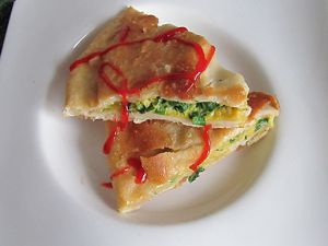 将饼切开后摆盘( 我上面还放了点番茄酱)