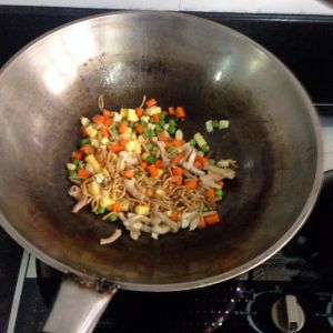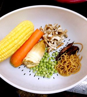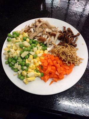 荷兰豆、冬笋和菇脚清洗后分别焯水,长丝豆腐干切碎,其余的食材都切粒,玉米粒我只削了半个,食材要多要少根据自己的需要