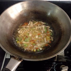 溶解好的淀粉倒入锅里转开大火,用铲子搅动锅里的食材烧至汤汁浓稠 ,最后加入适量鸡精