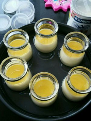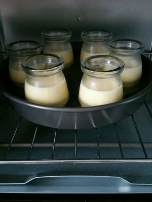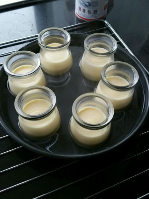将静置好的蛋奶液,平均倒入六个布丁瓶,加入热水
