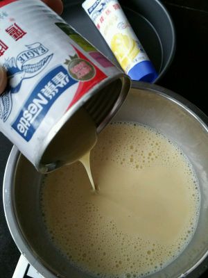取炼奶60克加入蛋奶液,继续搅拌均匀