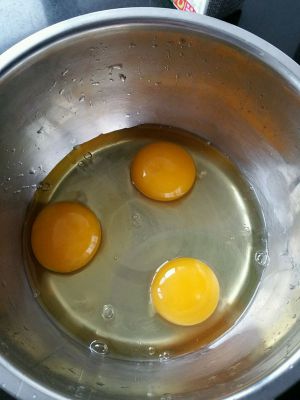 将鸡蛋打入盆中加入柠檬汁(柠檬汁我没有加),用手动打蛋器充分搅匀