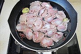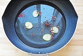 清水中加加入八角1个、花椒一撮、姜几片、盐一小勺、白酒1小勺;