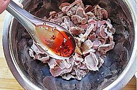 鸡胗里加入盐半小勺、糖半小勺、醋1小勺、辣椒油1小勺、味极鲜1小勺,拌匀;