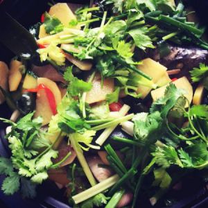 最后撒上葱段和香菜就好了。锵锵锵,重新换了个锅,煮开着吃,让鱼更入味
