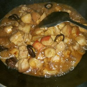 倒入猪肉后改成大火翻炒,加入八角和香菇(这两个可有可无,我个人不喜欢,不过我公公煮的话会加),加入白酒,加麦芽糖翻炒几下再加入排骨酱和叉烧酱,翻炒几下换成高压锅