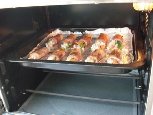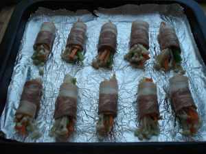 将培根卷起,放入铺了锡纸的烤盘。