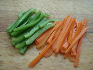 青椒、胡萝卜切条。