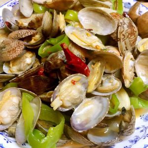 放入花蛤,加料酒和盐适量,大火翻炒至开口