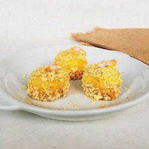 将虾仁插入土豆泥搓成圆 沾上玉米淀粉