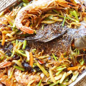 将炒至7分熟的配菜覆盖到鱼和虾身上,汤汁浇在上面;
