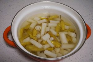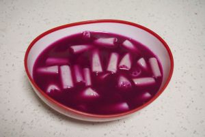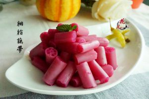 将藕带放入甘蓝汁里,腌制4小时以上,基本就都能上色了。 甘蓝汁本身没有味道,但有微涩口感,所以加了蜂蜜就好的多。