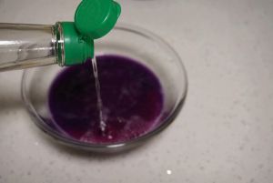 在甘蓝汁里缓缓加入少许白醋,白醋越多,颜色越呈现粉红色。在甘蓝汁里加入2大勺蜂蜜,这样腌制藕带后,会有淡淡的蜂蜜甜味。