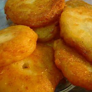 5.将加过面粉(定形)后成的土豆饼雏形放进平底锅里炸,记得用小火来做,否则会影响土豆饼的色泽。