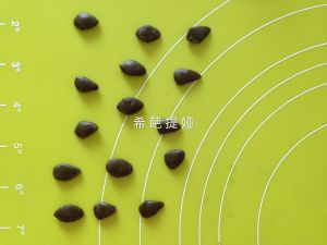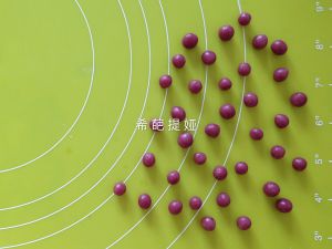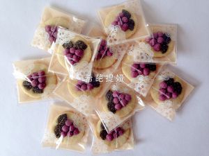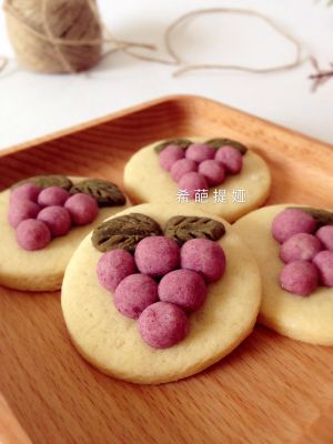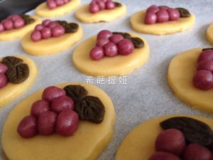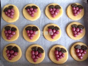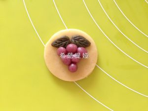 在圆形饼皮上把叶子和小圆放置成葡萄串的样子,相互之间稍微放紧凑些,不用刷蛋液之类的