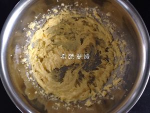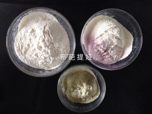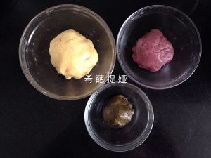 将搅打好的糊分成90g、60g、30g,分别筛入90g低粉、55g低粉和5g紫薯粉、27g低粉和3g抹茶粉