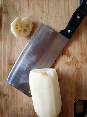 莲藕洗净削皮。